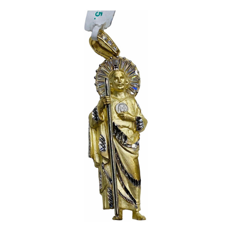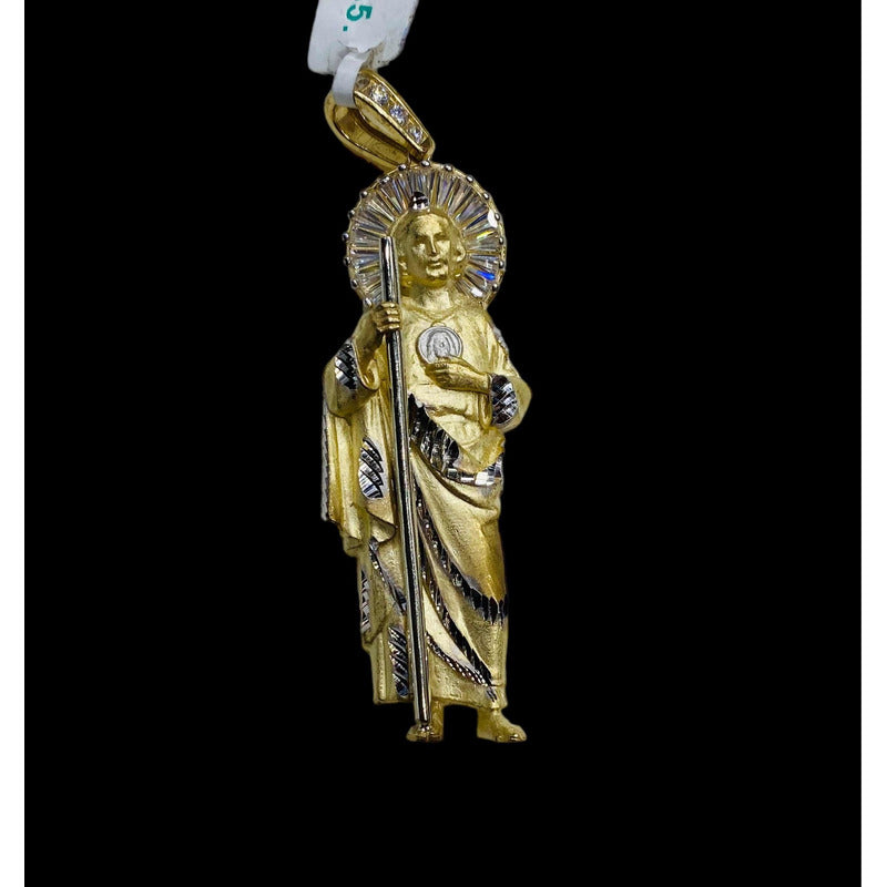 Hermoso dije de san judas Tadeo en oro de 10 kilates macizo El dije mide 7.5 cm de alto macizo en oro de 10 kilates Tu compra incluye: -Increíble dije en oro de 10 kilates macizo -Cadena de laminado de regalo -Paño de limpieza -Bolsa de terciopelo -Bolsa de boutique -Envio gratis a toda la República