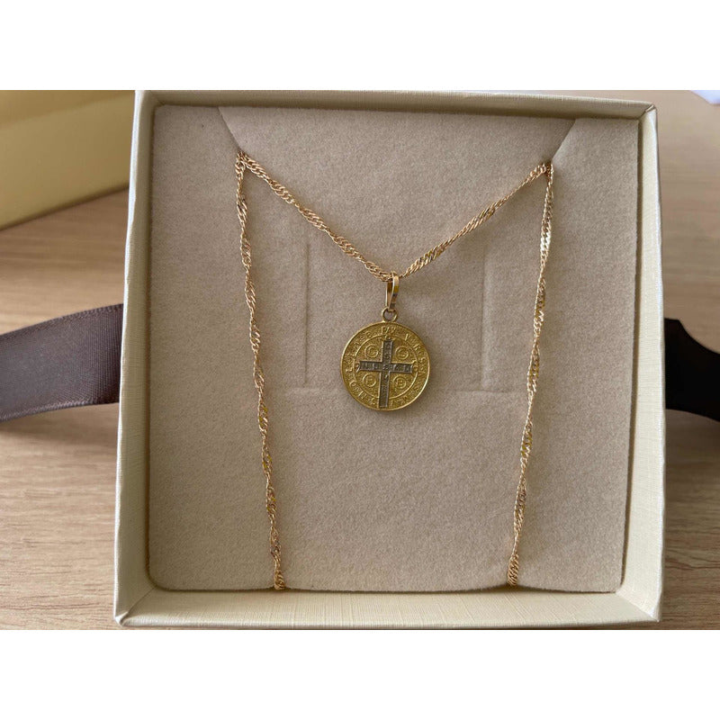 Medalla de San Benito elaborada de Oro macizo de 10 k Tiene 1.4 cm de diametro y 2.5 cm de alto con asa Tu compra incluye: - Estuche de regalo - Paño de limpieza - Bolsa de franela antipolvo - cadena de Oro laminado de Regalo - Envío a cualquier parte de la República